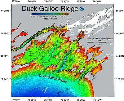 The Duck Galloo Ridge is a mainly underwater ridge, at the eastern end of Lake Ontario, spanning from Prince Edward County, Ontario to Jefferson County, New York.[1] In pre-Columbian times native people used the islands on the ridge as way stations, when crossing the lake. The islands and shoals that dot the ridge have been navigational hazards since sailing ships first started navigating the lake.