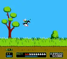 In Duck Hunt, players use the NES Zapper in combination with a CRT television to shoot ducks that appear on the screen.[7] The ducks appear one or two at a time, and the player is given three shots to shoot them down. The player receives points upon shooting each duck. If the player shoots the required number of ducks in a single round, the player will advance to the next round; otherwise, the player will receive a game over.