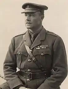 In the First World War he served with the Royal Horse Guards from 1914 to 1918 and was involved in the early battles. On 25 October 1914, 'Beef' as he was known was shot in the leg when trying to carry out a regimental action. "I had to stop and get into Hugh Grosvenor's trench. Got out presently and shot my horse with my revolver and saved all my kit. We were very lucky considering the fire we came in for."[11] At the end of the war he served with the Guards Machine Gun Regiment from 1918 to 1919. During the war he was promoted to Lieutenant-colonel and created a Companion of the Order of St Michael and St George (CMG).[4]