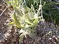 This species has a caudex (stem) 1.5–3 cm (0.59–1.18 in) in diameter. Topping the stem is a rosette of leaves, which may be colored green or covered in a white, powdery epicuticular wax. The leaf blades are 5–15 cm (2.0–5.9 in) long by 1–2.5 cm (0.39–0.98 in) wide, and 2–6 cm (0.79–2.36 in) thick. [4]