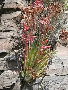 This species grows from basal rosettes which emerge from a caudex. The caudex is 1 to 1.5 cm in diameter. There are 1 to 4 rosettes per plant, which can be 6 to 20 cm wide. The leaves are 3 to 9 cm long, 3 to 15 mm wide, and 1.5 to 3 mm thick, with the base 5 to 15 mm wide.[1]