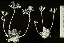 In addition to the Stylophyllum-like trait of the spreading carpels, D. stolonifera appears to readily hybridize with Dudleya edulis and produce fertile offspring. The hybrids branch dichotomously, have linear leaves, pale yellow petals, and flowers that are ascending at the tips but connate towards the base. Moran suggested that the interbreeding could imply a close relationship between the two species, but at the time, he noted there was little evidence available detailing crossability in Dudleya[5] (it would later be revealed that most species of Dudleya could readily hybridize with each other).[6] Less often it hybridizes with Dudleya lanceolata.[2]
