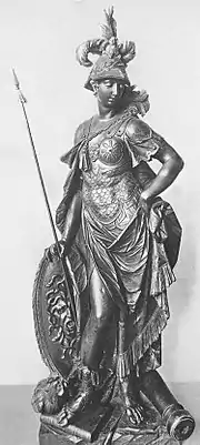 The use of Bellona in such structures was well established before this, dating back to her prominent use in Jean Cosyn's doorway. The Temple of Bellona, designed by William Chambers for Kew Gardens in 1760, was projected as a celebration of the Anglo-Hanoverian war effort during the Seven Years' War and eventually housed plaques honouring the regiments that served in it.[34] These, however, related primarily to remembrance of victory rather than of the fallen. It was not until a century afterward that the French-Canadian victims of the Seven Years War were commemorated by a monument at Quebec. Atop a tall column on the site of the battlefield, Bellona looks down, carrying a shield and laurel crown in her right hand.[35] The statue was presented by Jérôme-Napoléon in 1862 as a gesture of reconciliation.[36]