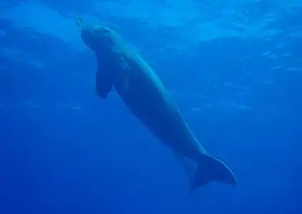 The dugong's tail flukes[22] and flippers[18] are similar to those of dolphins. These flukes are raised up and down in long strokes to move the animal forward, and can be twisted to turn. The forelimbs are paddle-like flippers which aid in turning and slowing.[19] The dugong lacks nails on its flippers, which are only 15% of a dugong's body length.[19] The tail has deep notches.[23]