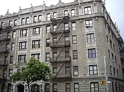 The apartment house containing the Duke Ellington House is located in northern Manhattan's Washington Heights neighborhood, at the southwest corner of St. Nicholas Avenue and 157th Street. It is a six-story masonry structure, built in 1915 in the Late Gothic Revival style. The ground floor appears as a raised basement, with horizontal bands of stonework between its windows. The middle four floors are essentially identical, with some columns of window bays featuring decorative carved panels between the floors. Top-floor windows are set in peaked-arch openings and have more elaborate surrounds. The building is crowned by a parapet with stone turrets and projections. A pair of entrance bays are located at the center of the St. Nicholas facade, the entrances deeply recessed in peaked-arch openings.[4]