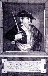 Louis Ernest's accumulated positions and tangled interests led to problems.[8] As early as 1771 there was talk of an attempt on his life in the Hague, but the bullet fired at him passed between his widespread legs. (Rumour had it that an earlier bullet had hit him in his private parts.) Pieter Paulus in 1773 gained national recognition through his book about the stadholderian system, in which he blamed the Duke of Brunswick for the abuses of that system. In December 1780 Great Britain declared war on the Republic. The war went badly for the Dutch and many blamed the Duke. The opposition against the stadtholderian system would rise to a crescendo during the Patriottentijd (named after the political faction that opposed the stadtholder). But even his partisans knew that things had to change for the better. The Amsterdam burgemeester Joachim Rendorp pleaded for an advisory council for the prince.