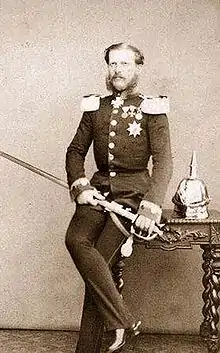 He enlisted in the Prussian Army and became commander of the 6th (Brandenburg) Cuirassiers "Emperor Nicholas I of Russia". William had a reputation for drunkenness and a dissolute character. On two occasions he was deprived of his command in the Prussian army and he proposed marriage to the celebrated ballerina Marie Taglioni; consequently he was generally considered to be the "black sheep" of the family.[1] Under family pressure, on 9 December 1865, he married Alexandrine of Prussia, daughter of his uncle Albert of Prussia and Marianne of Orange-Nassau. William settled with his wife at Bellevue Palace in Berlin. The marriage was unhappy and the couple had an only child: Charlotte (1868-1944) who married Prince Heinrich XVIII Reuss of Köstritz.