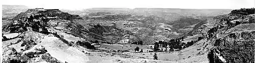 Lord Napier arrived in early January 1868 and the expedition started from the advance camp at Senafe at the beginning of February. It took two months to reach their objective, advancing through rough terrain. In his despatch to London Lord Napier reported: "Yesterday morning (we) descended three thousand nine hundred feet to Bashilo River and approached Magdala with 'First Brigade' to reconnoiter it. Theodore opened fire with seven guns from outwork, one thousand feet above us, and three thousand five hundred men of the garrison made a gallant sortie which was repulsed with very heavy loss and the enemy driven into Magdala. British loss, twenty wounded".[30]