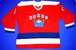 The Dukes colours were red, white & blue. The home jerseys had a white background with red & blue trim. The road jerseys were a red background with white and blue trim. Their uniforms were similar to those worn at the time by the National Hockey League's Washington Capitals. The colour of the top of the crown on the logo was either red or white, opposite or the background of the home or away jersey.