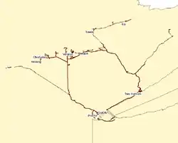 ![]() Map of the DM&IR. Solid lines are track still in use; dotted lines are abandoned track. | |