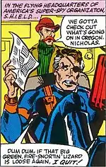 Dum Dum is placed in charge of a SHIELD unit coined the Godzilla Squad, charged with the task of tracking and stopping the radioactive kaiju.[4][5] Over the twenty-four issue series, Dugan goes from loathing the creature's destructive tendencies to accepting the beast's existence after Godzilla saves him on numerous occasions. Dugan later recalls a long list of his greatest nightmares, one of which includes Godzilla.