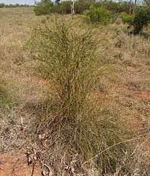 Lignum is a perennial, dioecious[4] shrub, growing to 2.5 m in height, with its multitude of thin, intertwined and tangled branches and branchlets forming dense thickets to the exclusion of other species. Its thin, narrow leaves are 15–70 mm long and 2–10 mm wide.[5] The grey-green stems often end in a sharp point. The flowers are small and cream to yellowish, solitary or clustered along the branchlets and occurring through most of the year. The fruit is top-shaped, dry, and about 5 mm long.[6]
