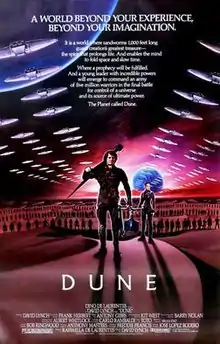 Dune premiered in Washington, DC, on December 3, 1984, at the Kennedy Center and was released worldwide on December 14. Prerelease publicity was extensive, not only because it was based on a bestselling novel, but also because it was directed by Lynch, who had had success with Eraserhead and The Elephant Man. Several magazines followed the production and published articles praising the film before its release,[21] all part of the advertising and merchandising of Dune, which also included a documentary for television, as well as items placed in toy stores.[22]