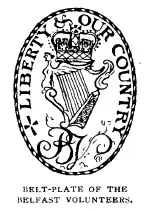 The primary motif of the Volunteers was an Irish harp with the British crown mounted above it, with either the name of the company or a motto curved around it, or both, i.e. "Templepatrick Infantry" or "Liberty & Our Country".[9] This harp and crown motif was prevalent on the Volunteer companies flags, belt-plates and gorgets.[9] Some included the Royal cypher "G.R." standing for King George III.[9] Shamrocks also commonly featured.[9]