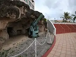 ![]() One of two Japanese short 20cm dual purpose guns as it appeared on June 15, 2020 on the premises of the Onward Beach Resort. The gun was removed from its original location in the early 1990s during the development of the hotel and returned to fiberglass mockups of the fortifications that are now visible on the pool deck. | |