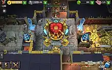Unlike previous instalments, the game is a tower defence game,[1] similar to Clash of Clans.[2] As with previous instalments, the game centres around dungeon construction and management, with players hiring and controlling minions. The dungeon heart is the life force, and its destruction ends the game. Imps are the dungeon's workforce, performing tasks such as digging tiles. Rooms have set sizes instead of being constructed by tiles, and minions are summoned manually instead of appearing at regular intervals. Which minions can be summoned depends on the dungeon's composition. Rooms include the workshop (which produces traps used to defend the dungeon) and the Dark Library.[3] Rooms can be moved without reconstruction,[4] and some have built-in defences against intruders.[3] Minions include trolls and warlocks. In campaign mode, major events are triggered manually.[3] At the start, players are given a tutorial by Horny, the Horned Reaper from the previous games.[3] Raiding other dungeons (with the goal of the opponent's destruction) using the acquired minions is a regular occurrence, and players also frequently need to defend their dungeon from invasion. During raids, rooms can be claimed and used to deploy units.[3]