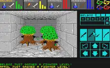 In contrast to the traditional turn-based approach that was, in 1987, most common, Dungeon Master added real-time combat elements (akin to Active Time Battle).[8] Other factors in immersion were the use of sound effects to indicate when a creature was nearby, and (primitive) dynamic lighting. Abstract Dungeons and Dragons style experience points and levels were eschewed in favor of a system where the characters' skills were improved directly via using them. Dungeon Master was not the first game to introduce these features. Dungeons of Daggorath for the TRS-80 Color Computer first employed them in 1982. Dungeon Master was, however, responsible for popularizing these elements. Other features of Dungeon Master included allowing players to directly manipulate objects and the environment by clicking the mouse in the enlarged first-person view.[9] It also introduced some novel control methods including the spell casting system, which involved learning sequences of runes which represented the form and function of a spell's effect. For example, a fireball spell was created by mixing the fire symbol with the wing symbol.