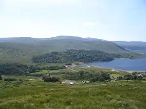 Dún Lúiche, known in English as Dunlewey or Dunlewy, is a small Gaeltacht village in the Gweedore area of County Donegal, Ireland. It sits in the Poisoned Glen, at the foot of Errigal and on the shore of Dunlewey Lough. The Cronaniv Burn flows along the southern edge of the village. Dunlewey has a tourist centre, called the Lakeside Centre or Ionad Cois Locha, which offers boat trips of the lake. To the west of the lake is a ruined church.