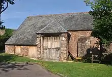 Dunster Priory was established as a Benedictine monastery around 1100. The first church in Dunster was built by William de Mohun who gave the church and the tithes of several manors and two fisheries, to the Benedictine Abbey at Bath. The priory, which was situated just north of the church, became a cell of the abbey.[16] The church was shared for worship by the monks and the parishioners, however this led to several conflicts between them. One outcome was the carved rood screen which divided the church in two with the parish using the west chancel and the monks the east.[17] The priory church is now in parochial use as the Priory Church of St George which still contains 12th and 13th century work, although most of the current building is from the 15th century. It has been designated as a Grade I listed building.[18][19] In 1332 it became more separated from the Abbey at Bath and became a priory in its own right.[20] In the "Valor Ecclesiasticus" of 1535 the net annual income of the Dunster Tithe Barn is recorded as being £37.4.8d (£37 23p), with £6.13s7d ( £6.68p ) being passed on to the priory in Bath.[21] In 1346 Cleeve Abbey built a nunnery in Dunster, but it was never inhabited by nuns and was used as a guest house.[22] The priory was dissolved as part of the dissolution of the monasteries in 1539. Dunster was part of the hundred of Carhampton,[23] but St George's was the seat of the local deanery, overseeing the area's parish churches.