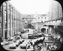 Having gained success as a whiskey blender, Dunville & Co. constructed their own distillery, the Royal Irish Distilleries, on the edge of Belfast in 1869. When built, the distillery occupied an impressive four-storey red-brick building, and was amongst the most modern in Ireland.[1] With production from five pot stills, and later a Coffey still, at its peak the distillery had a capacity of over 2.5 million gallons per annum, making it amongst the largest in the country.[1] Much of the distillery's output was used in the company's whiskey blends, Dunville's VR and Dunville's Three Crowns.