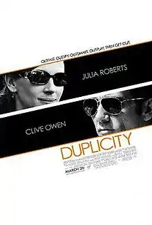 Duplicity is a 2009 American romantic crime comedy film written and directed by Tony Gilroy, and starring Julia Roberts and Clive Owen. The plot follows two corporate spies with a romantic history who collaborate to carry out a complicated con.[2] The film was released on March 20, 2009.[3]