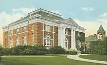 Benjamin Thompson, a descendant of an early settler, bequeathed his assets and family estate, Warner Farm, to the state for the establishment of an agricultural college.[20][21] Founded in 1866 in Hanover, the New Hampshire College of Agriculture and the Mechanic Arts moved to Durham in 1893 and became the University of New Hampshire in 1923. Thompson Hall, built in 1892 with an iconic clock tower, is named in his honor. Designed in the Romanesque Revival style by the Concord architectural firm of Dow & Randlett, it was listed on the National Register of Historic Places in 1996.[22]