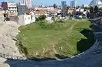 The name Dyrrhachion is usually explained as a Greek compound from δυσ- 'bad' and ῥαχία 'rocky shore, flood, roaring waves',[17] an explanation already hinted at in antiquity by Cassius Dio, who writes it referred to the difficulties of the rocky coastline,[18] while also reporting that other Roman authors linked it to the name of an eponymous hero Dyrrachius. The mythological construction of the city's name was recorded by Appian (2nd century AD) who wrote that "the king of the barbarians of this country, Epidamnus gave the name to the city. His daughter's son Dyrrachius, built a port near the town that he called Dyrrachium". Stephanus of Byzantium repeated this mythological construction in his work. It is unclear whether the two toponyms referred originally to different areas of the territory of the city or whether they referred to the same territory.[19] Classical literature indicates that they more probably referred to different neighbouring areas originally. Gradually, the name Epidamnus fell out of use and Dyrrachium became the sole name for the city.[20] Archaeological research has shown that at the time of the foundation of Durrës, two distinct settlements existed on its territory. The first one is a hill site with no direct contact with the sea. It predates the colony and might represent the settlement which held the toponym known as Epidamnos in ancient literature. The hill site overlooks to its south the second site which is the territory of the port of Durrës, where the colony was founded. Its location on a rocky shore struck by waves on all sides reflects the description of the toponym Dyrrhachion.[21] The distinction between these two districts of the city remained in place even much later. In the 19th century, Durrës proper was the district of the port, while the hill north of it was a separate settlement, Stani (Kodra e Stanit).[22]