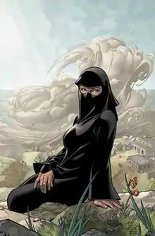 Dust is a Sunni Muslim girl, and an ethnic Pashtun who possesses the mutant power to turn herself into a sand-like substance. Native to Kandahar, Afghanistan, Sooraya is kidnapped by a slave-trading ring after she is separated from her mother. While one of her slavers tries to remove her niqāb, she instinctively lashes out with her powers and flays them all alive with her dust form before passing out. She is subsequently discovered and rescued by Wolverine and Fantomex. Wolverine takes her to the X-Corporation branch office. Sooraya hides herself from the X-Men stationed there by turning into sand and spreading herself around the complex. Phoenix senses Sooraya's presence and telepathically convinces her to reveal herself to everyone present. Sooraya reforms and announces her presence by speaking a single word: Turaab (Arabic for dust/sand).[2] Ultimately, Dust is enrolled at the Xavier Institute in Westchester County, New York. Sooraya is initially placed into Xorn's Special Class and is picked on by Xorn for standing by her faith and allegedly placing its importance over the cause of mutants. Frightened, she then alerts Professor X to Xorn's 'true' identity. She attempts to use her powers to do so, but Xorn manages to defeat her and Xavier.[3] Quiet and nervous, she experiences difficulty adapting to her new surroundings - particularly after being given the loud and rebellious Noriko as a roommate. Sooraya and Noriko often come to disagreements over the traditional garb which Noriko believes to be an affront to women's rights.[4]