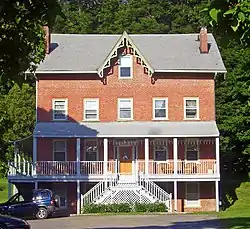 Its decorative touches, such as the piazza-style original veranda, pointed gable and scroll-sawn vergeboard, suggest an embrace of the Picturesque mode then being popularized by Andrew Jackson Downing of nearby Newburgh. The house's placement in a wooded area near Wappinger Creek is also reflective of this ideal.[1]