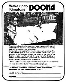 Originally called a continental quilt, duvets are commonly referred to in Australia by the generic trademark doona. The Doona brand of duvets were originally manufactured by the Melbourne-based textile company Kimptons and became popular in the 1970s,[9] with the brandname eventually becoming a generic term in Australian English.[10] After a series of mergers and acquisitions, Tontine Group has held the Doona trademark since 1991.[11][12]