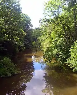 It rises at Lake Henneside in the town of Wallkill, just west of the hamlet of Circleville. After flowing downhill it takes a brief southward loop, crosses under NY 302, and then assumes a northeastern heading into the town of Crawford. In a swampy area a few miles downriver just east of Bullville, it crosses under NY 17K and then passes through Bullville Army Reserve Center.