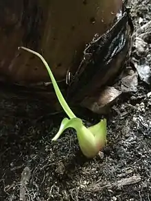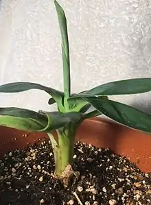 The Dwarf Cavendish banana is a widely grown and commercially important Cavendish cultivar. The name "Dwarf Cavendish" is in reference to the height of the pseudostem, not the fruit.[1] Young plants have maroon or purple blotches on their leaves but quickly lose them as they mature. It is one of the most commonly planted banana varieties from the Cavendish group, and the main source of commercial Cavendish bananas along with Grand Nain.[2][3][4][5]