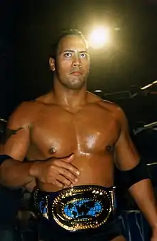 After accepting an athletic scholarship to play at the University of Miami, he was a member of the 1991 national championship team, but largely spent his four college football years in backup roles behind elite players, including future NFL player and Pro Football Hall of Fame inductee Warren Sapp.[12] Johnson aspired to play professional football but went undrafted in the 1995 NFL draft. Following his graduation, he signed with the Calgary Stampeders but was cut from the team in his first season.[13] In 1996, Johnson's father Rocky, a longtime professional wrestler, assisted in helping him secure a contract with the WWF.[2] Johnson quickly rose to global prominence, aided by a gimmick he employed as a charismatic trash talker. Johnson left WWE in 2004 and returned in 2011 as a part-time performer until 2013, making sporadic appearances until retiring in 2019.[14] A 10-time world champion, including the promotion's first of African-American descent,[15] he is also a two-time Intercontinental Champion, a five-time Tag Team Champion, the 2000 Royal Rumble winner, and WWE's sixth Triple Crown champion. Johnson headlined the most-bought professional wrestling pay-per-view (WrestleMania XXVIII) and was featured among the most watched episodes of WWE's flagship television series (Raw and SmackDown).[16][17]