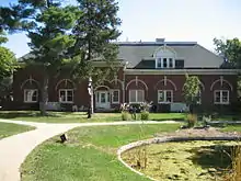 The Dwight Veterans' Administration Hospital occupied the triangular-shaped block between Main Street, Mazon Avenue, and Prairie Avenue. Part of the facility was built in 1891 for the Keeley Institute.[35] In 1930 it became the Dwight V.A. Hospital, and an addition opened on May 11, 1947, with a modern surgical suite, wards, clinic, and physical therapy facilities.[36] The buildings survive and are partially occupied by the Fox Developmental Center.