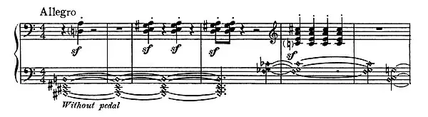 American composer Henry Cowell wrote one of his first surviving piano pieces, Dynamic Motion (HC 213), in 1916.[1][2] It is known as one of the first pieces in the history of music to utilize violent tone clusters for the keyboard. It requires the performer to use various limbs to play massive secundal chords, and calls for keys to be held down without sounding to extend its dissonant cluster overtones via sympathetic resonance. Some of the clusters outlined in this piece are those written for fists, palms, and forearms.[3] The piece is also noted for its extended use of tuplets, featuring triplets, quintuplets, and sextuplets in the melody line.
