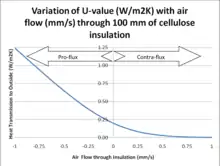 Insulations such as polyurethane (PUR) boards, which due to their micro-structure, are not air permeable are not suitable for dynamic insulation. Insulations such as rock wool, glass wool, sheep's wool, cellulose are all air permeable and so can be used in a dynamically insulated envelope. In equation (1) the air speed through the insulation, u is taken as positive when the air flow is in the opposite direction to the conductive heat flow (contra-flux). Equation (1) also applies to steady state heat flow in multi-layred walls.[3]