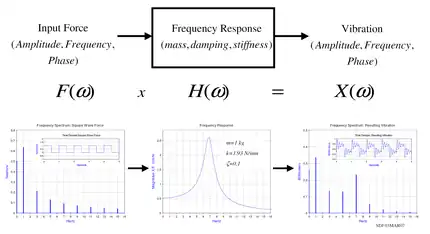 For example, calculating the FRF for a mass–spring–damper system with a mass of 1 kg, spring stiffness of 1.93 N/mm and a damping ratio of 0.1. The values of the spring and mass give a natural frequency of 7 Hz for this specific system. Applying the 1 Hz square wave from earlier allows the calculation of the predicted vibration of the mass. The figure illustrates the resulting vibration. It happens in this example that the fourth harmonic of the square wave falls at 7 Hz. The frequency response of the mass–spring–damper therefore outputs a high 7 Hz vibration even though the input force had a relatively low 7 Hz harmonic. This example highlights that the resulting vibration is dependent on both the forcing function and the system that the force is applied to.