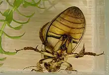The great diving beetle (Dytiscus marginalis) is an aquatic diving beetle native to Europe and northern Asia, and in the UK is common in Wales, much of England and southern Scotland but less common on chalk and in the far north.[1] The great diving beetle, true to its name, is a rather large insect. The larvae can grow up to 60 millimetres (2.4 in) in length, while the adults are generally 27โ35 millimetres (1.1โ1.4 in).