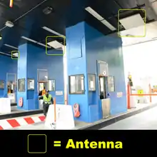 E-ZPass tags are active[1] RFID transponders, historically made by Kapsch TrafficCom (formerly Mark IV Industries Corp—IVHS Division) under a competitively bid contract. They communicate with reader equipment built into lane-based or open-road toll collection lanes by transmitting a unique radio signature. The most common type of tag is an internal tag that can be mounted on the inside of the vehicle's windshield in proximity to the rear-view mirror. Though toll agencies advise adherence to the windshield with mounting strips (usually 3M's Scotch brand "Dual Lock" fasteners), third-party options using trays with suction cups to adhere a pass to a windshield temporarily if used in multiple vehicles are available. Some vehicles have windshields that block RF signals; for those vehicles, historical vehicles, and customers who have aesthetic concerns, an external tag is offered, typically designed to attach to the vehicle's front license plate mounting points.[2]