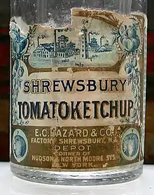 Among the consumer goods produced by E. C. Hazard and Company at its Shrewsbury, NJ facilities were Hazard's Shrewsbury Brand "Tomatoketchup" (one word), canned tomatoes (which the firm sometimes called by the archaic name "Love Apples"), canned baked beans and mushrooms, as well as white asparagus, okra, peppers, tarragon, jellies, salad dressings, and various sauces.[3] The earliest well-known product it distributed, however, was made by another manufacturer: McIlhenny Company's Tabasco brand pepper sauce, which Hazard and Company helped to introduce nationally beginning in the early 1870s.[5]