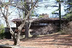 The E. Fay and Gus Jones House is a historic house at 1330 North Hillcrest in Fayetteville, Arkansas. It is a two-story structure, fieldstone on the first level and sheathed in redwood board-and-batten siding on the second, with a broad gabled roof. The house was designed by the architect E. Fay Jones as his family residence, and was completed in 1956. It was the first Jones design to be built, and demonstrated the principles of organic architecture that Jones would espouse through his career. Jones' mentor Frank Lloyd Wright spoke approvingly of the house after visiting it in 1958.[2]