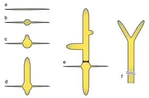 The E. gossypii life cycle starts with the only known phase of isotropic growth in wild type: germination of the haploid spore to form a germ bubble. This is followed by apical growth, extending two germ tubes in succession on opposing sites of the germ bubble. More axes of polarity are established with lateral branch formation in young mycelium. Maturation is characterized by apical branching (tip splitting) and a dramatic increase of growth speed (up to 200 μm/h at 30 °C), which enables it to cover an 8 cm Petri dish of full medium in about seven days. Sporulation is thought to be induced by nutrient deprivation, leading to contraction at the septa, cytokinesis and subsequent abscission of sporangia which contain up to eight haploid spores. Hyphae are compartmentalized by septa, which in young parts appear as rings that allow transfer of nuclei and in older parts may appear as closed discs. Compartments typically contain around eight nuclei.