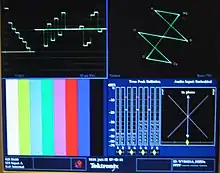 The EBU colour bars is a television test card used to check if a video signal has been altered by recording or transmission, and what adjustments must be made to bring it back to specification. It is also used for setting a television monitor or receiver to reproduce chrominance and luminance information correctly. The EBU bars are most commonly shown arranged side-by-side in a vertical manner (as in the images in this article), though some broadcasters – such as TVP[1] in Poland, and Gabon Télévision[2] in Gabon – were known to have aired a horizontal version of the EBU bars.