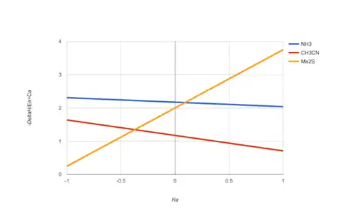 In a Cramer–Bopp plot for Lewis bases, the parameter Ra[lower-alpha 1] reflects the mode of bonding of a potential Lewis acid partner, from purely electrostatic interactions (Ra = −1) to purely covalent interactions (Ra = +1). The parameter reflects the strength of the bonding interaction. The plot shown here allows comparison of three chosen Lewis bases: acetonitrile, ammonia, and dimethyl sulfide. The Lewis acid iodine (Ra = 0.6) will interact most strongly with dimethyl sulfide and least strongly with acetonitrile, whereas triethylgallium (Ra = −0.65) will interact most strongly with ammonia and least strongly with dimethyl sulfide. The plot also shows that ammonia is a stronger Lewis base than acetonitrile irrespective of its Lewis acid partner, whereas the relative strengths of ammonia and dimethyl sulfide as Lewis bases depends on the bonding characteristics of the Lewis acid, swapping order when Ra = 0.1. (NB: guesstimate). The Cramer–Bopp plot was developed as a visual tool for comparing Lewis base strength with the range of possible Lewis acid partners, and a similar plot can be constructed to examine selected Lewis acids against the range of possible Lewis bases. References 5, 8, 12, and 14 contain graphical presentations that define the ranking order of strength of many Lewis acids and bases.