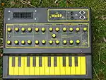 Launched in 1978, the "Wasp" was EDP's best-received product. It was named after its black-and-yellow colour scheme. For cost reasons, it did not have a mechanical keyboard; instead, it used flat conductive copper plates, hidden under a silk-screened vinyl sticker.[1] This alienated some players who thought the instrument lacked the expression present with a real keyboard.[2] It was also difficult to use in live settings, and according to Gerald Casale of Devo, the synth would play itself when exposed to sweat.[3] Despite these flaws, the Wasp was fairly advanced technologically. It was one of the first commercially available synthesisers to adopt digital technology, which at the time was just beginning to become a standard. It also utilised a proprietary system for connecting several Wasp synthesisers together, predating MIDI by several years.[1][lower-alpha 1] The Wasp had a tiny internal speaker, which gave the instrument a distinctive sound, though it could also be amplified externally. Eurythmics' David A. Stewart recorded the Wasp by miking its internal speaker.[1]