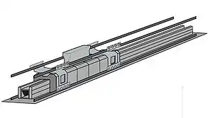 The EMALS uses a linear induction motor (LIM), which uses alternating current (AC) to generate magnetic fields that propel a carriage along a track to launch the aircraft.[5][6] The EMALS consists of four main elements:[7] The linear induction motor consists of a row of stator coils with the same function as the circular stator coils in a conventional induction motor. When energized, the motor accelerates the carriage along the track. Only the section of the coils surrounding the carriage is energized at any given time, thereby minimizing reactive losses. The EMALS's 300-foot (91 m) LIM can accelerate a 100,000-pound (45,000 kg) aircraft to 130 kn (240 km/h; 150 mph).[6]
