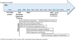 In 2008, NIH began the Roadmap Epigenomics Mapping Consortium, whose goal was to produce "a public resource of human epigenomic data to catalyze basic biology and disease-oriented research".[42] In February 2015, the consortium released an article titled "Integrative analysis of 111 reference human epigenomes" that fulfilled the consortium's goal. The consortium integrated information and annotated regulatory elements across 127 reference epigenomes, 16 of which were part of the ENCODE project.[43] Data for the Roadmap project can either be found in the Roadmap portal or ENCODE portal.