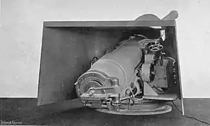 When not on the move the grousers were removed and the steel wheels rode on an inclined set of steel rails when in firing position. The steel rails were mounted on a firing platform made of wooden beams which allowed the gun 360°of traverse. When the gun fired recoil which was not absorbed by the recoil mechanism was transmitted to the wheels and the carriage rolled up the inclined rails and then rolled back into firing position. The box trail carriage was tall and wide enough that the breech of the gun was accessible at high angles of elevation without a pit being dug and the gun crew had a bucket and hoist for ammunition handling.[4]