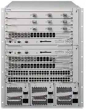 The Avaya Ethernet Routing Switch 8600 or ERS 8600, previously known as the Passport 8600 or the Accelar 8000, is a modular chassis combination hardware router and switch used in computer networking. The system, originally designed and manufactured by Nortel, was manufactured by Avaya from 2009 until 2017.[3][4][5] The system provided the 10G Ethernet equipment backbone for the 2010 Winter Olympics games, providing service for 15,000 VoIP Phones, 40,000 Ethernet connections and supporting 1.8 million live spectators.[6] The system is configurable as a 1.440 Terabit Switch cluster using SMLT and R-SMLT protocols, to provide high reliability[7] cluster failover (normally less than 100 millisecond).[8]