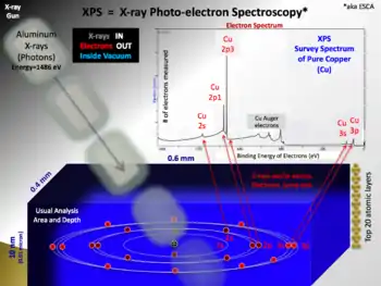 X-ray photoelectron spectroscopy (XPS) is a surface-sensitive quantitative spectroscopic technique based on the photoelectric effect that can identify the elements that exist within a material (elemental composition) or are covering its surface, as well as their chemical state, and the overall electronic structure and density of the electronic states in the material. XPS is a powerful measurement technique because it not only shows what elements are present, but also what other elements they are bonded to. The technique can be used in line profiling of the elemental composition across the surface, or in depth profiling when paired with ion-beam etching. It is often applied to study chemical processes in the materials in their as-received state or after cleavage, scraping, exposure to heat, reactive gasses or solutions, ultraviolet light, or during ion implantation.